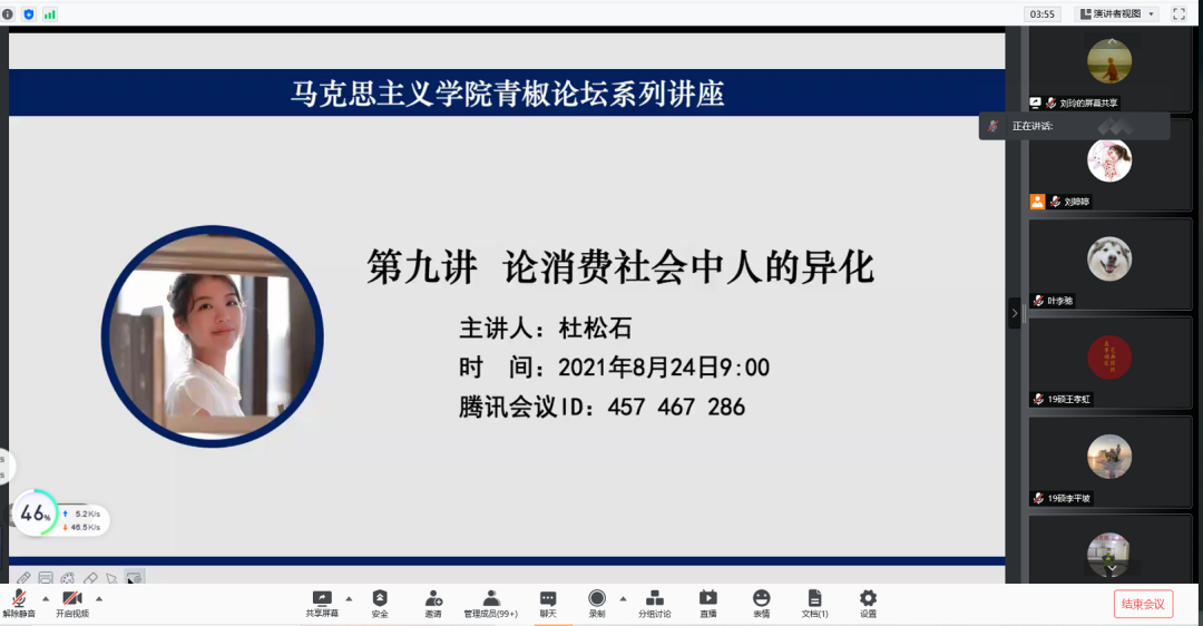 为积极引导员工从马克思主义经典中汲取力量,深入理解马克思主义的理论内涵,提升理论素养,深刻反思现实问题,304永利集团304永利集团“青椒论坛”第九讲于2021年8月24日上午正式开讲。青年教师杜松石以“论消费社会中人的异化”为题,给大家带来了一堂生动且富有营养的学术讲座。刘玲担任本次讲座的主持人,304永利集团全体师生包括55名21级本硕博新生参加了此次活动。