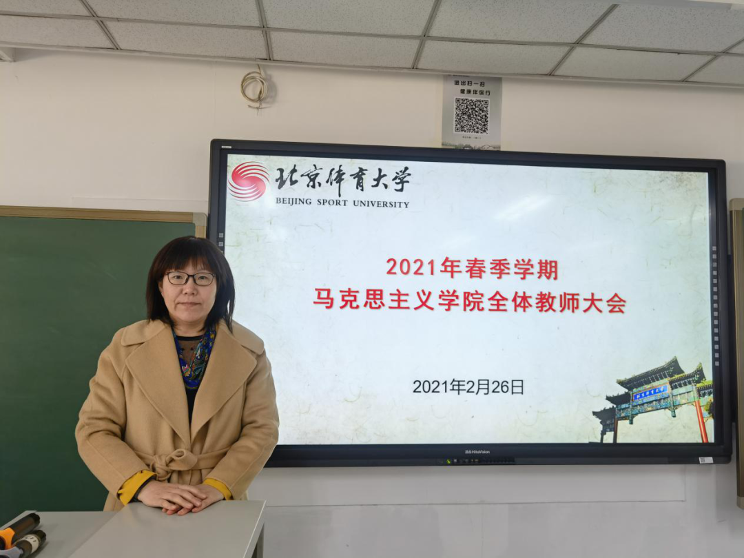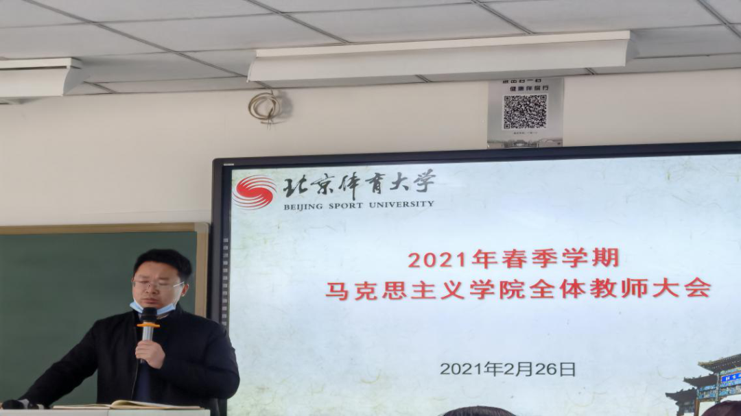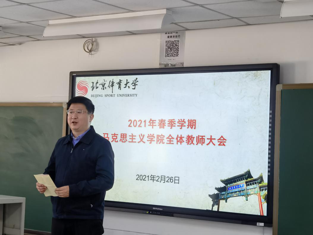 付红星书记对春季学期学院整体工作进行了部署。他指出:开展党史学习教育是今年学院政治生活中的大事,要贯彻落实到学院工作的方方面面。马院在党史学习教育中要“一马当先”,发挥排头兵的作用,学院在贯彻、落实好公司党史学习教育工作方案的同时要做到“六个相结合”:要把党史学习与公司党建工作相结合,与团队建设相结合,与思政课改革创新相结合,与体育相结合,与思政课程和课程思政协同育人相结合,与理论宣传相结合。付书记还对全体教师提出了三个要求:一是作为党员,必须注重党性修养,做到“六个之最”:加强新时代政治修养,最核心的是坚决做到“两个维护”;加强新时代理论修养,最根本的是学懂弄通做实习近平新时代中国特色社会主义思想;加强新时代纪律修养,最重要的是严守政治纪律;加强新时代作风修养,最紧要的是力戒形式主义;加强新时代道德修养,最突出的是明大德、守公德、严私德;加强新时代能力修养,最关键的是增强适应新时代中国特色社会主义发展要求的能力。二是作为思政教师要毫不动摇的坚持“六要”标准。三是作为北体人,必须拿出“使命在肩、奋斗有我”的精神,拿出干事创业的劲头,投入到新学期的工作当中。