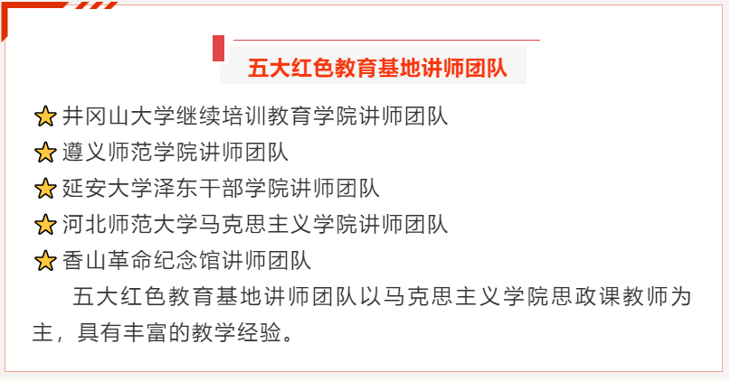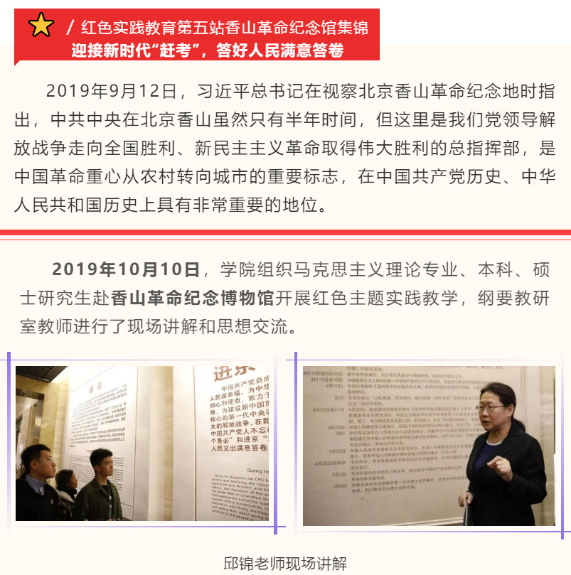 “革命传统教育”是为马克思主义理论专业员工量身定做的红色信仰之旅,是公司马克思主义理论专业课程建设的一大特色,是贯彻理论与实践结合教育理念的重要体现。通过利用全国各地的红色教育资源,探访重大历史事件发生地,还原历史场景和历史过程,结合现场教学重温历史,引导员工识读中国共产党革命文化的优秀成果——党的丰富多彩的革命精神谱系,感悟真理的魅力和信仰的力量,学习革命先辈和英雄的初心意识和使命担当意识。该课程总学时为172,其中理论学时52,实践学时120,要求本科生至少完成4次实践,获得8个社会实践学分方可毕业。