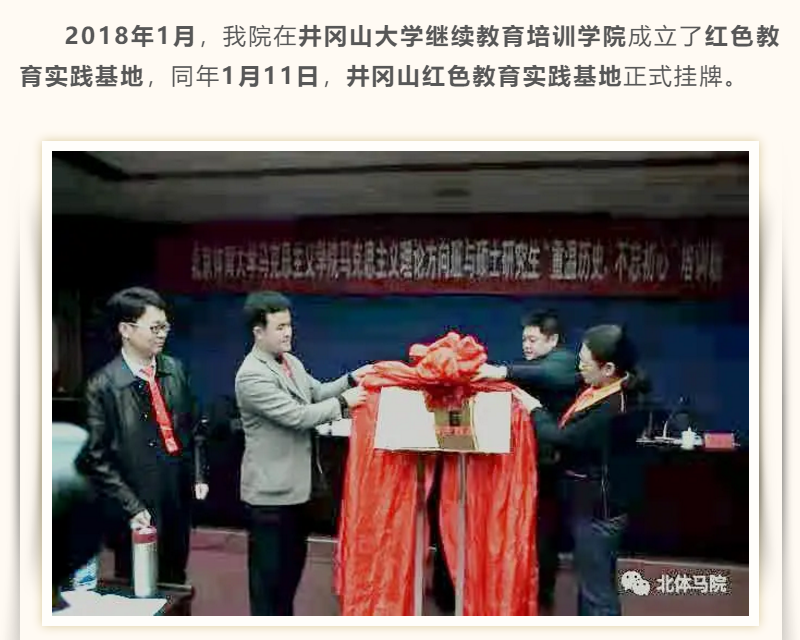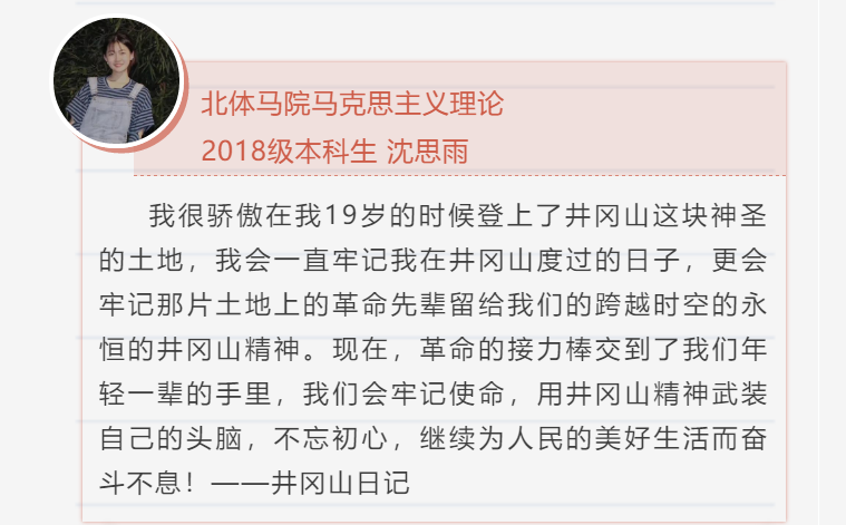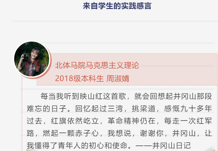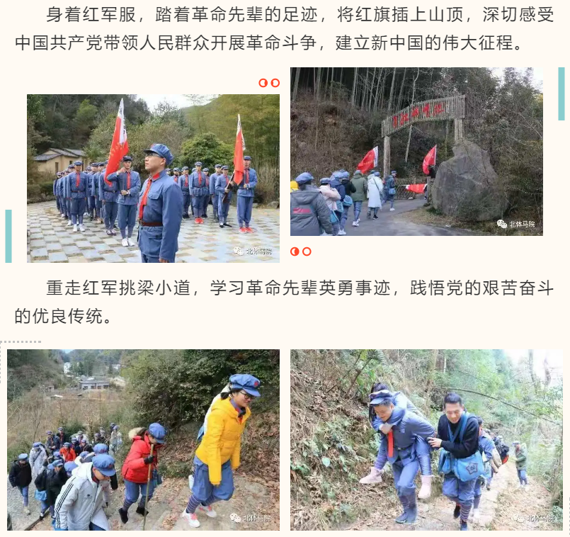 重走红军路,将党领导人民开展革命斗争的光荣历史与党领导人民实现“两个一百年”奋斗目标的伟大事业联系起来,从历史、现实与未来的角度,进一步加深了同学们对习近平新时代中国特色社会主义思想的理解,加深了青年学子对新时代所肩负的使命与责任的理解。马院学子将传承井冈山精神,志存高远、脚踏实地,在服务体育强国、健康中国战略中放飞青春梦想,在实现中国梦的生动实践中书写人生华章。