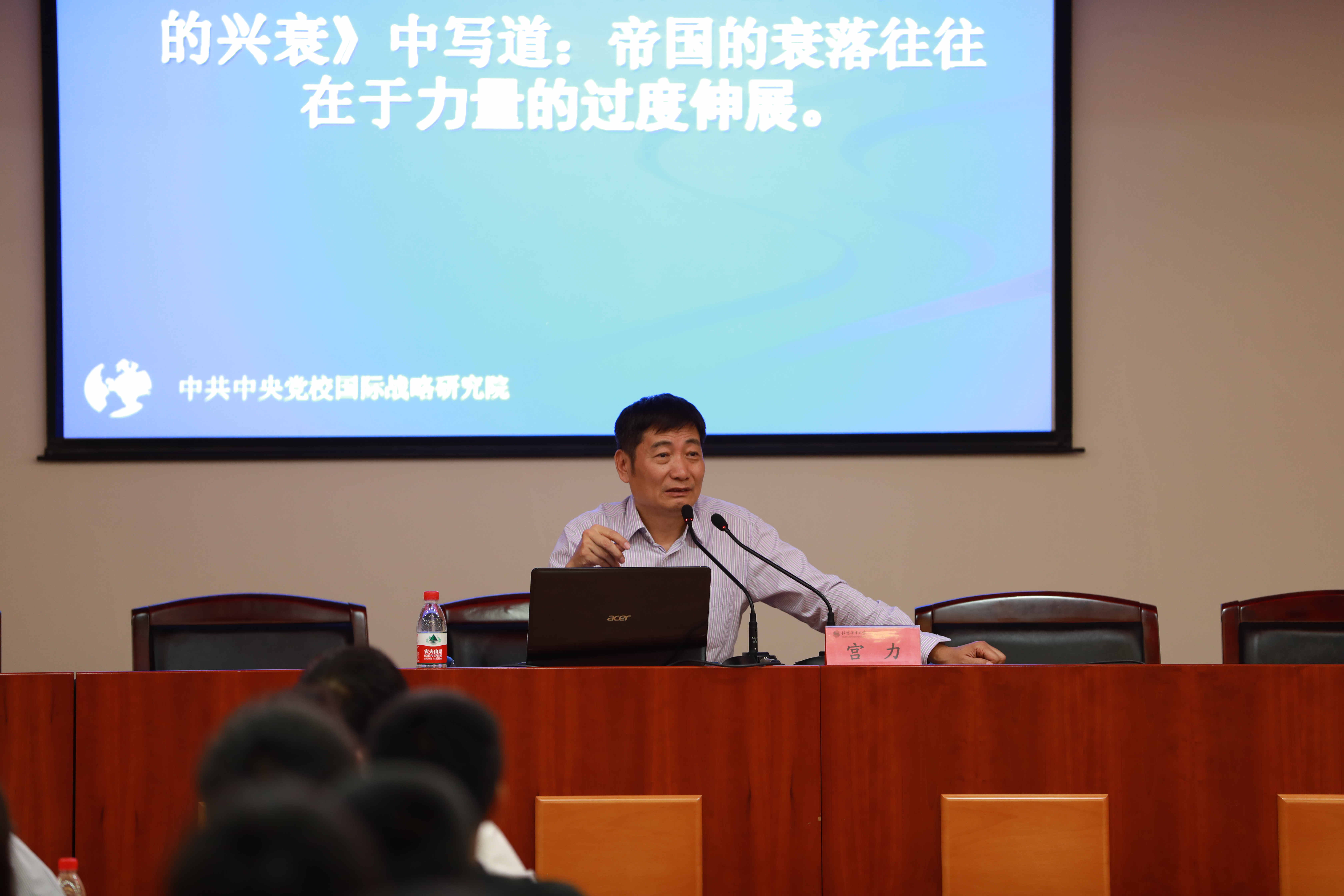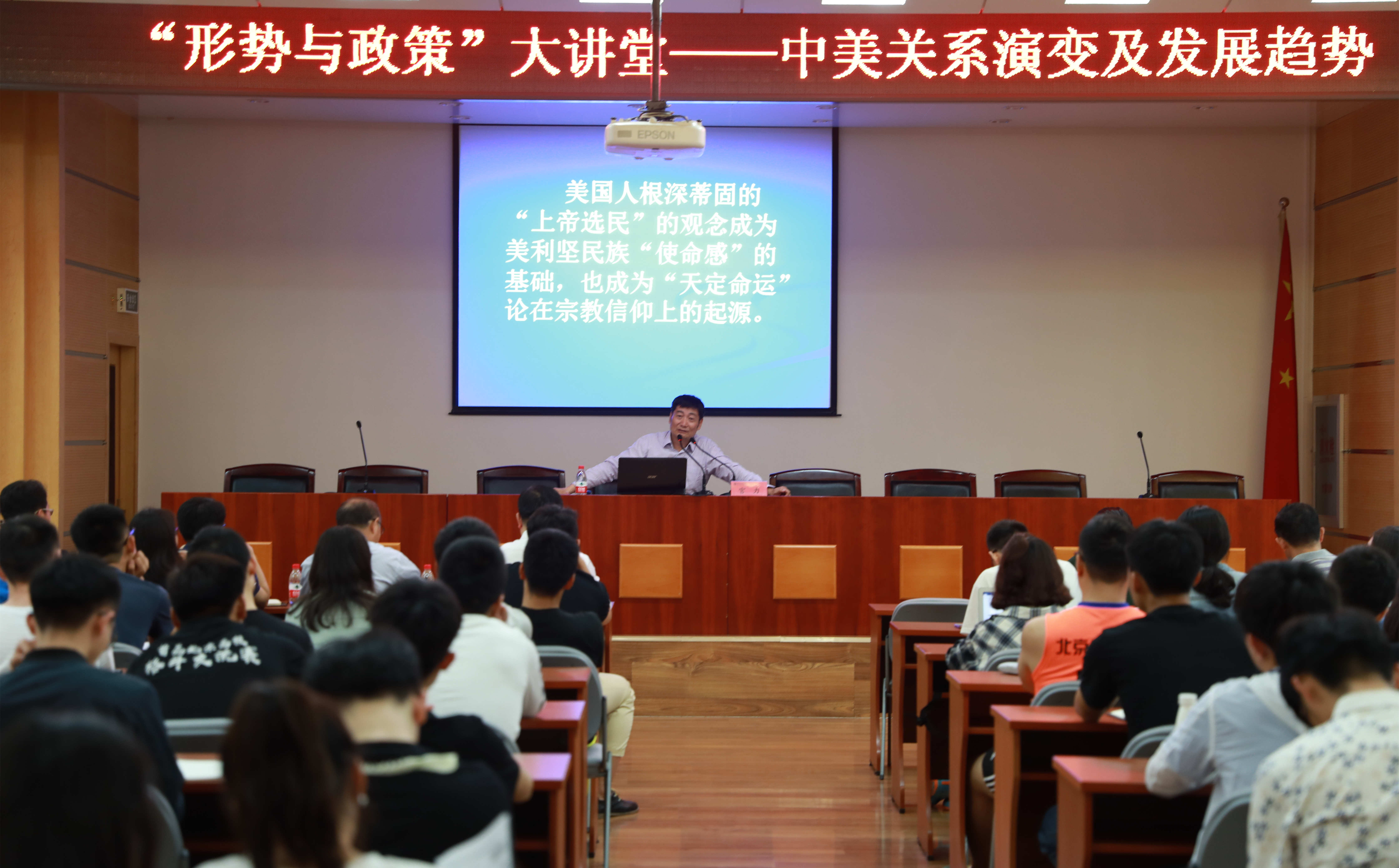 为进一步学习贯彻全国高校思想政治工作会议的重要精神,扎实落实教育部关于加强“形势与政策”课建设的若干意见,在公司党委领导下,304永利集团创新思政课公司产品方式,专门开设“形势与政策”大讲堂,发挥形势政策教育的主渠道、主阵地作用,特邀国内知名中美关系专家、中央党校国际战略研究所所长宫力教授,于2018年5月17日19:00在北办302会议室举行大讲堂第一次讲座,讲座由马克思主义公司党总支书记付红星主持。本次讲座的主题是“中美关系演变及发展趋势”。