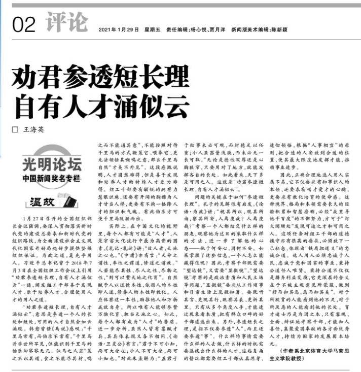 《光明日报》刊登了公司王海英教授的评论文章《劝君参透短长理 自有人才涌似云》。