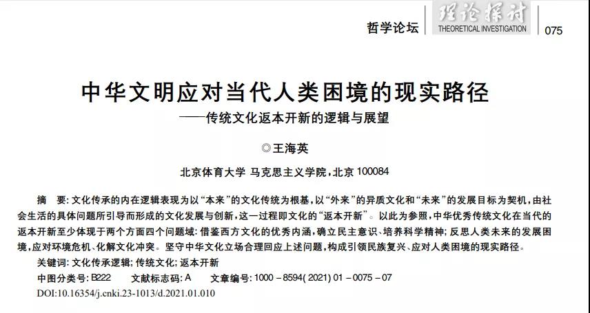 王海英教授在《理论探讨》发表学术论文《中华文明应对当代人类困境的现实路径—传统文化返本开新的逻辑与展望》。