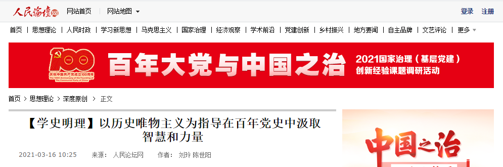 青年教师刘玲和陈世阳副教授在人民论坛网发表理论文章《以历史唯物主义为指导在百年党史中汲取智慧和力量》。