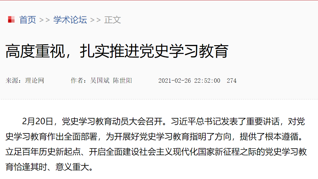 青年教师吴国斌和陈世阳副教授在中共中央党校理论网发表理论文章《高度重视,扎实推进党史学习教育》。
