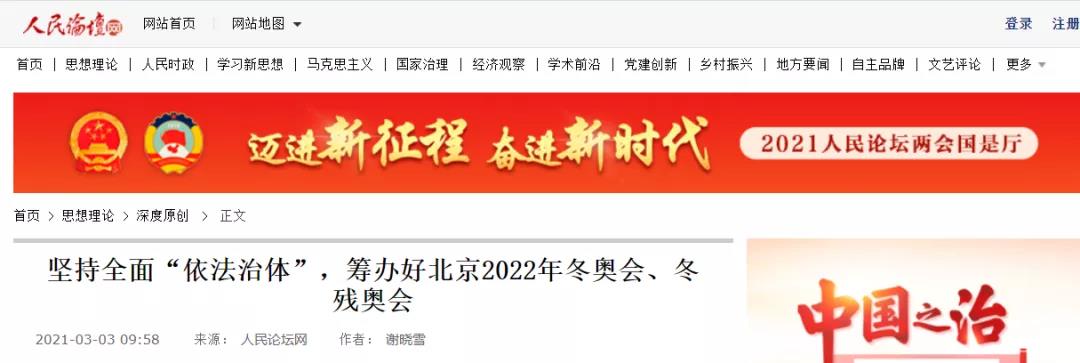 谢晓雪副教授在人民论坛网发表理论文章《坚持全面“依法治体”,筹办好北京2022年冬奥会、冬残奥会》。