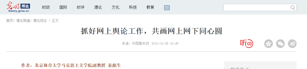 秦彪生副教授在中国青年网发表理论文章《抓好网上舆论工作,共画网上网下同心圆》。
