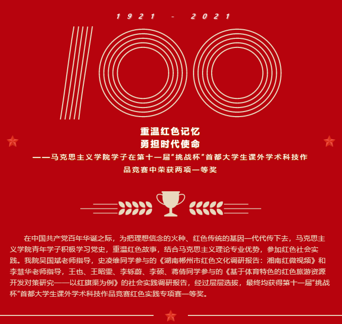 独立编创《基于体育特色的红色旅游资源开发对策研究——以红旗渠为例》短视频并撰写调研报告,获第十一届“挑战杯”首都老员工课外学术科技作品竞赛红色实践专项赛一等奖。