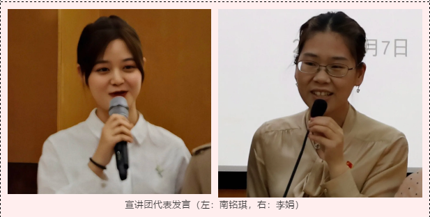 吴国斌表示在全国掀起党史学习教育热潮的背景下,学院的党史学习教育宣讲团是青年教师、员工提升马克思主义理论功底的一个重要的平台,马院的青年教师将以“奋斗有我”的使命感积极投身党史学习教育的宣传过程,为建党100年作出贡献。刘玲谈到,此次的党史学习教育既是青年教师成长的重要机会,也是一个挑战,我们青年教师将全力以赴投入党史学习教育的宣讲当中,将坚决地服从公司党委和公司党总支交付我们的工作和安排。秦彪生指出,百年党史宣讲对每一个马院人而言都是一个重任,希望广大同学积极加入到党史宣讲的工作,在宣讲的同时自我提高、自我学习、自我完备。齐冰强调,人类社会发展的基本规律、社会主义发展的基本规律、无产阶级政党执政的基本规律其实都包含在党的百年历程当中,需要我们认真地学习研究党史。同时,她还热情鼓励同学们也加入宣讲行列。