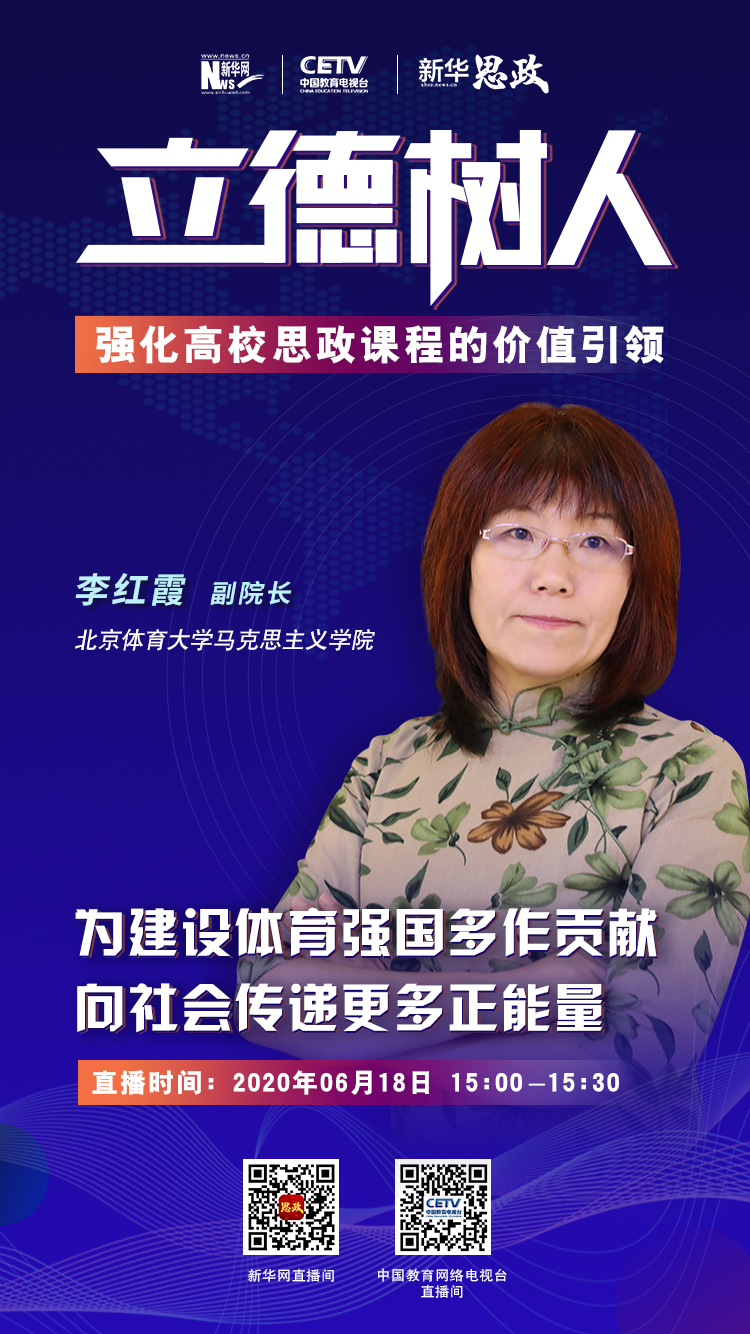 近日,由新华网和中国教育电视台联合推出 2020 年“新华思政”系列直播,围绕“立德树人 强化高校思政课程的价值引领”话题,在特殊时期助力高校思政教学工作。304永利集团304永利集团李红霞教授应邀走进新华网直播课堂,作为该活动第五期主讲嘉宾,以“为建设体育强国多作贡献,为社会传递更多正能量”为主题,和大家一起重温总书记回信并进行了深入解读。本次“新华思政”直播活动由304永利集团联合教务处、北体传媒完成。直播当日吸引近54万人在线观看,受到了社会各界人士、在校师生的广泛好评。