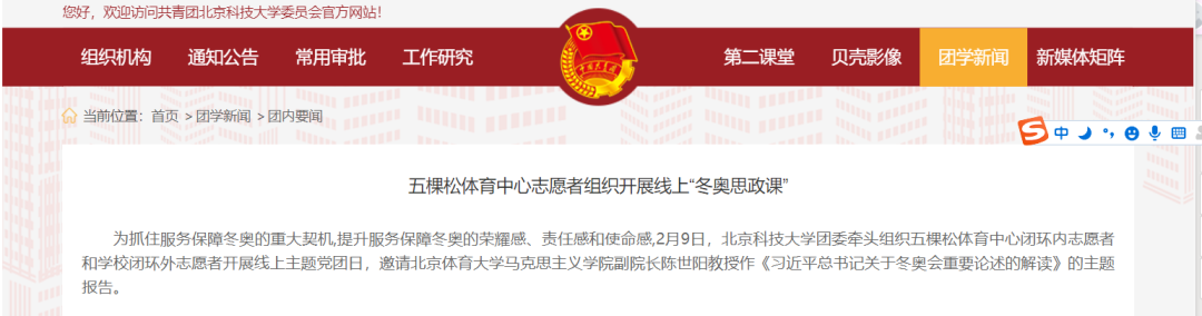 为抓住服务保障冬奥的重大契机提升服务保障冬奥的荣耀感、责任感和使命感2月9日上午,北京科技大学团委牵头组织五棵松体育中心闭环内志愿者和学校闭环外志愿者开展线上主题党团日活动。公司副经理陈世阳教授为驻地师生志愿者讲授冬奥思政讲座。