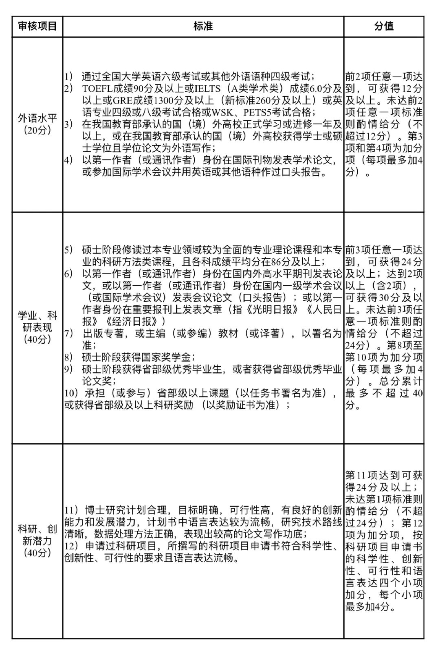 笔试考核专业外语和专业理论;面试考核专业外语口语听力水平、科研能力和综合素质(综合素质不计入量化考核评分中,分为及格和不及格两项),面试成绩为各专家评分的平均值(去掉一个最高、一个最低);考核全程进行录音录像。